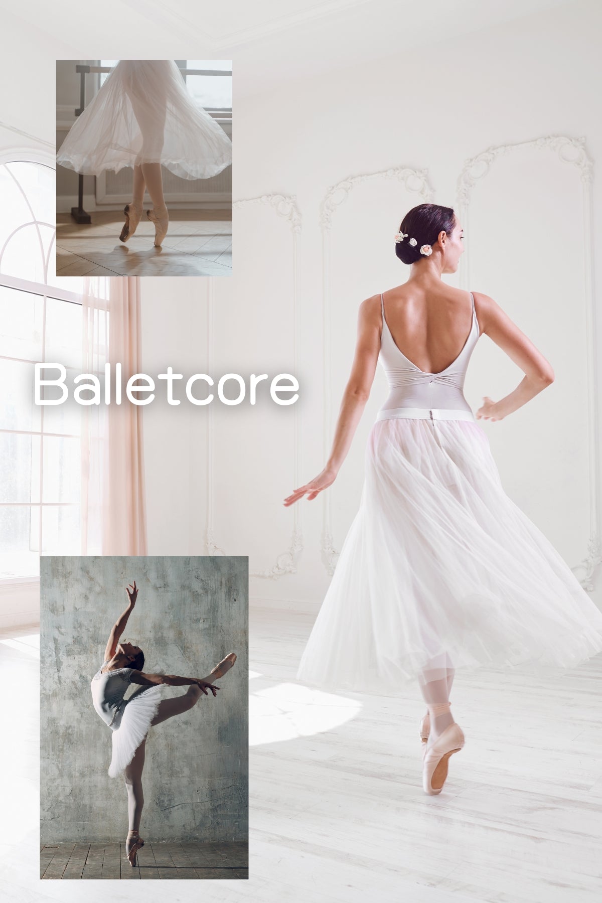 「BALLET」と「CORE」をあわせた造語で、バレリーナをイメージしたファッションを指します。バレエとファッションを融合させたバレエコアの特徴は、優雅で動きやすい設計がなされています。甘さや儚げさを取り入れ、くすんだカラーを基調としているところもポイントとなります。また、レースやサテン、リボン、チュチュをイメージさせるチュール素材などもポイントとなります!