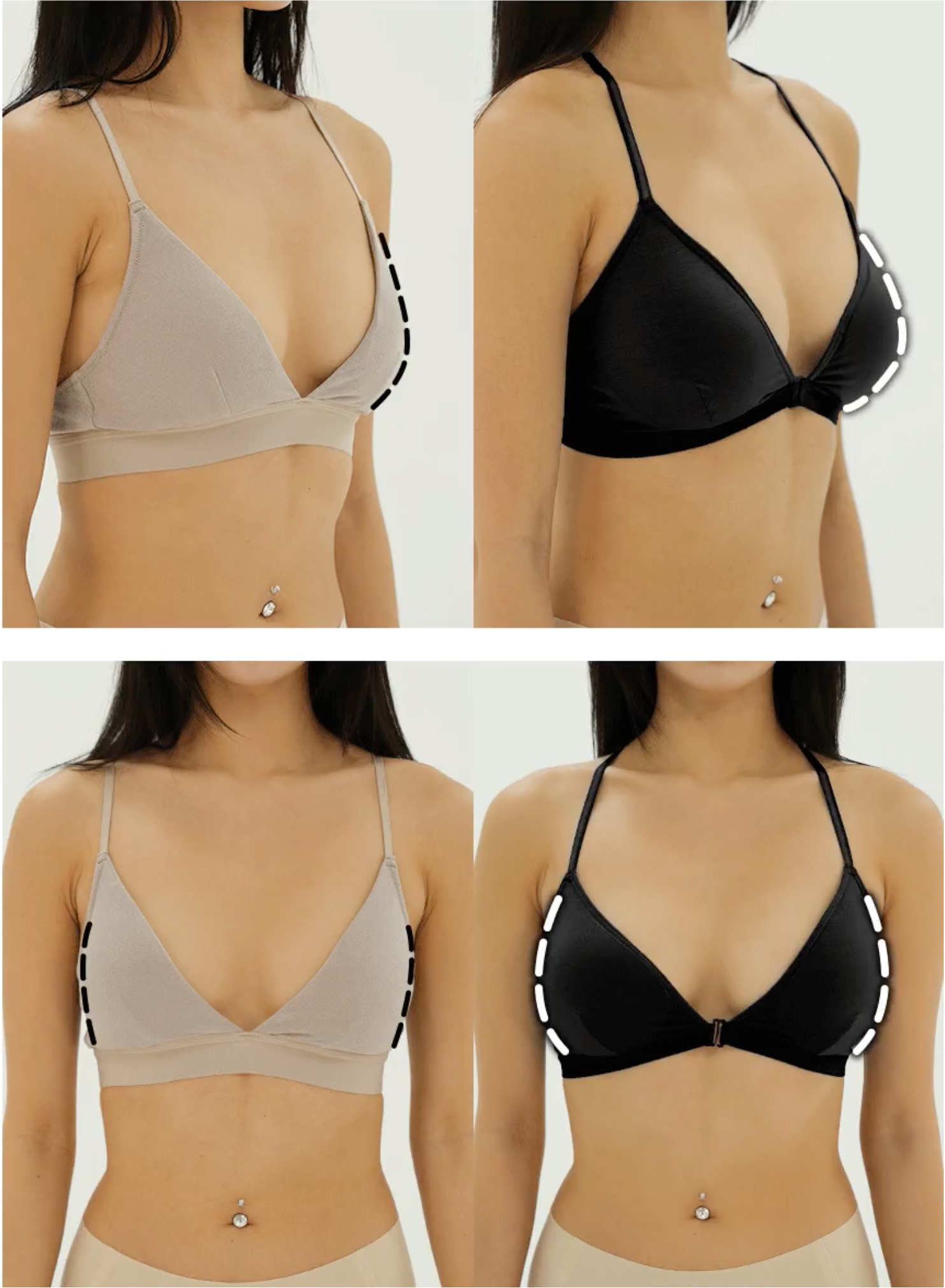従来:サイドバストをサポートするために、余分な生地を縫い付けた三角パッド