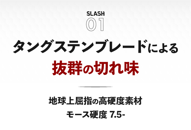 Slashのブレードは耐久性、耐摩耗性に優れた高硬度の素材タングステンを使用しています。ロープや革も切ることができる鋭い切れ味が持続します。